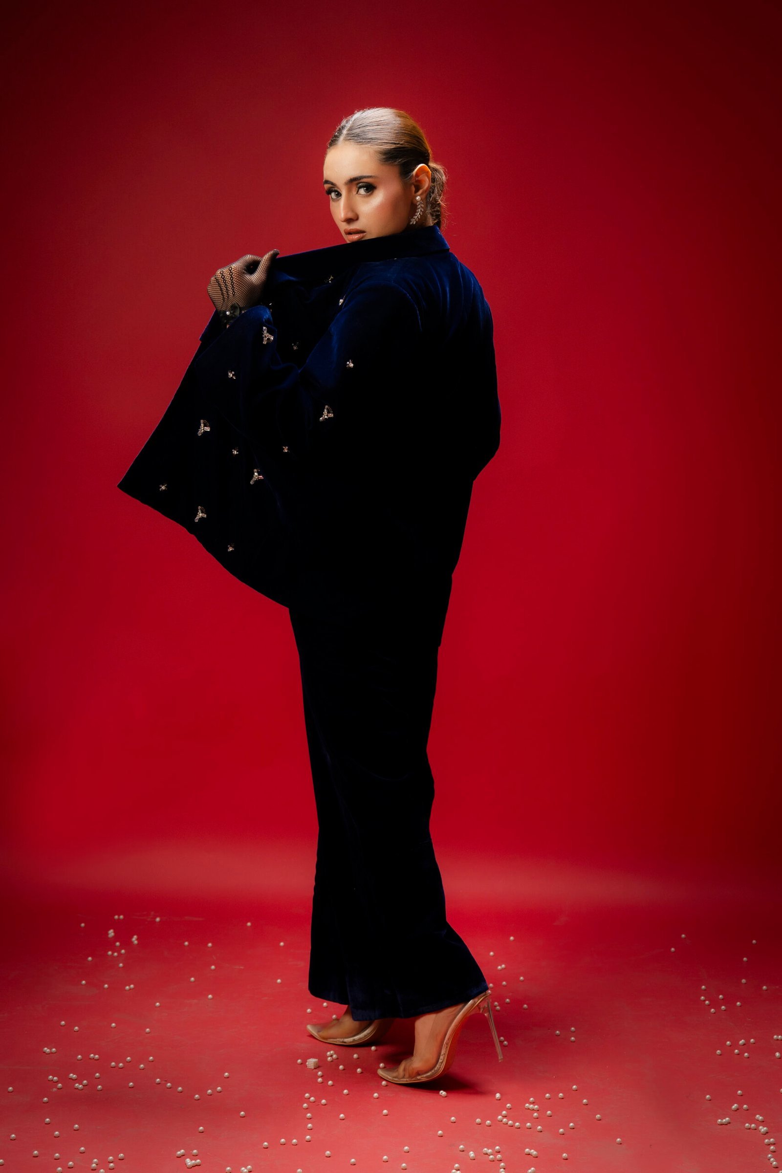 * Trousers: Matching velvet trousers, tailored for comfort and elegance