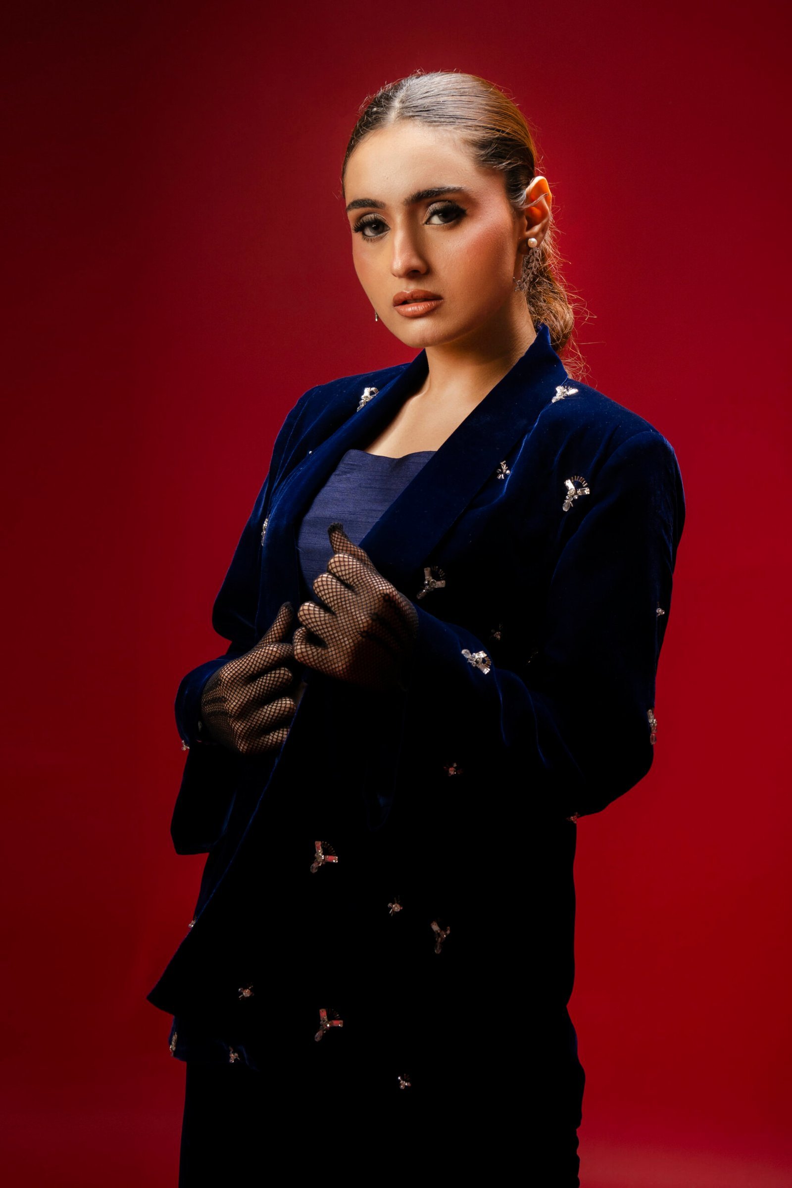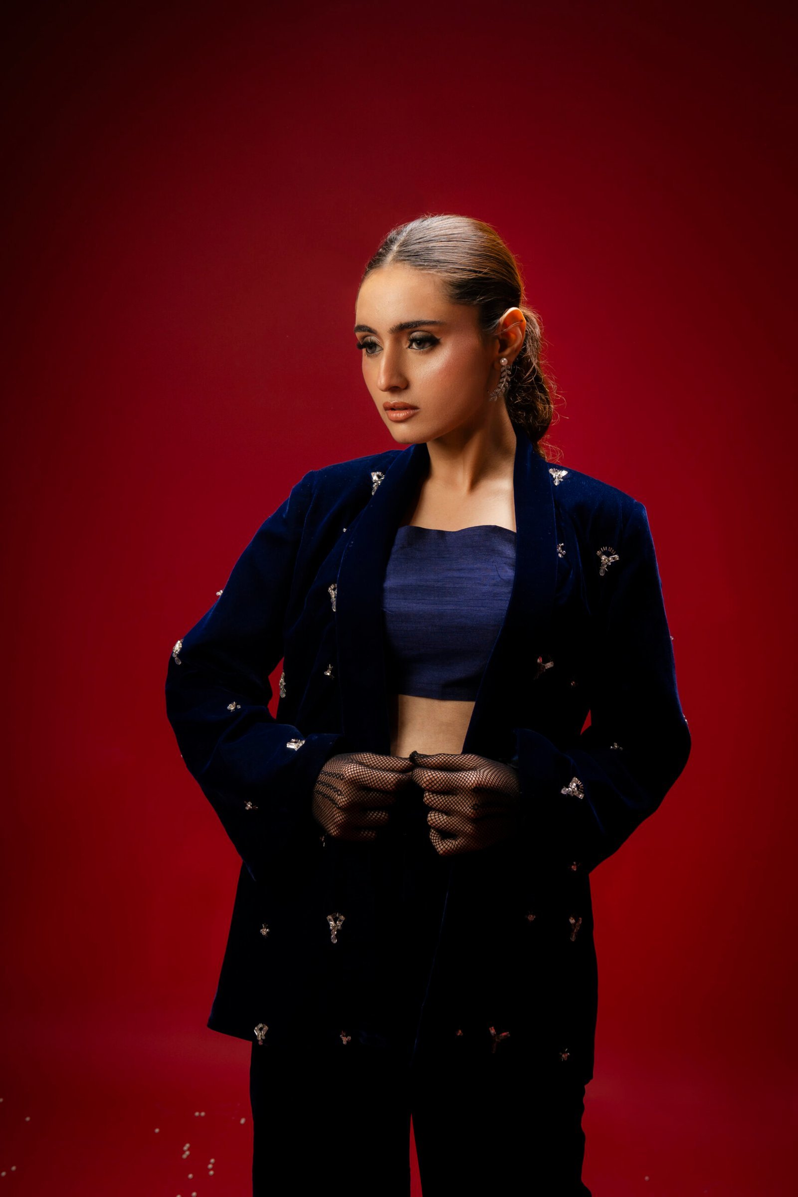 A statement of contemporary elegance, this deep navy-blue velvet ensemble is perfect for festive soirées and special occasions. The structured blazer is adorned with delicate hand embellishments, adding a refined sparkle, while the cropped inner top creates a chic, modern layered effect. Paired with tailored velvet trousers, the ensemble exudes sophistication and a commanding presence.