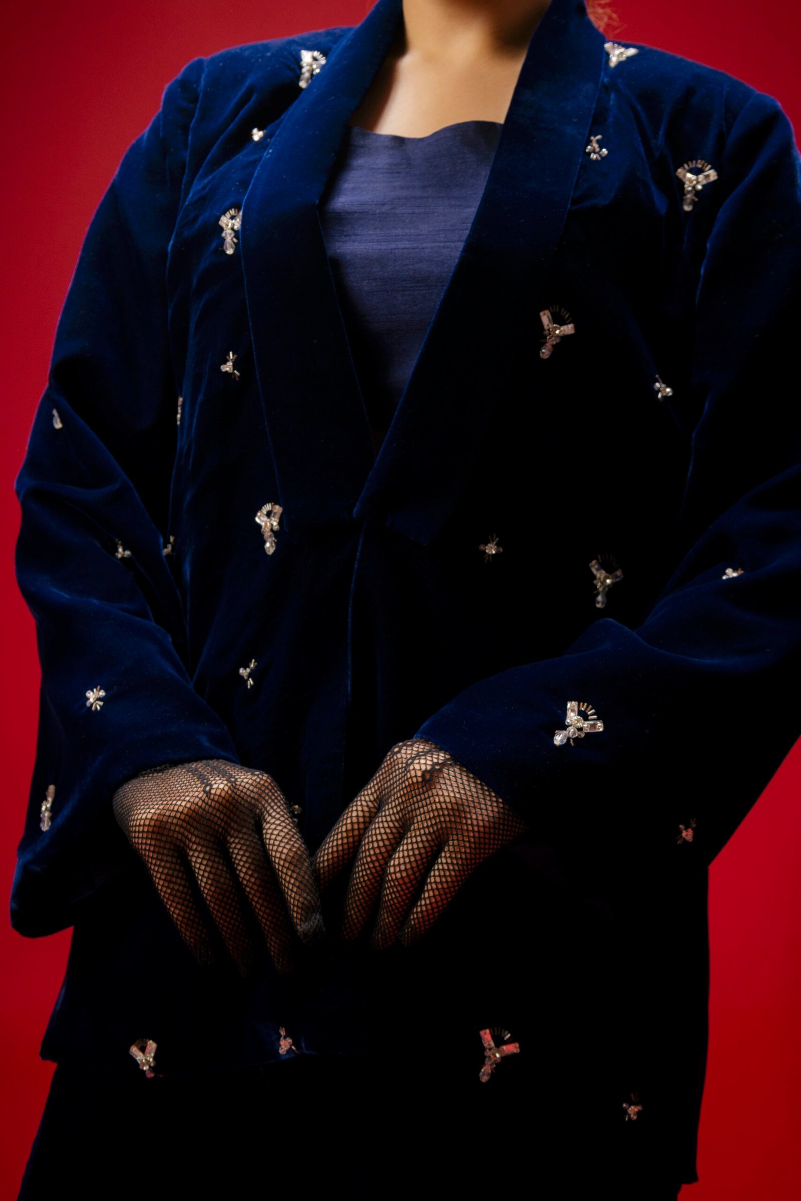 * Blazer: Hand-embellished velvet with intricate dabka, tilla, and sequin detailing