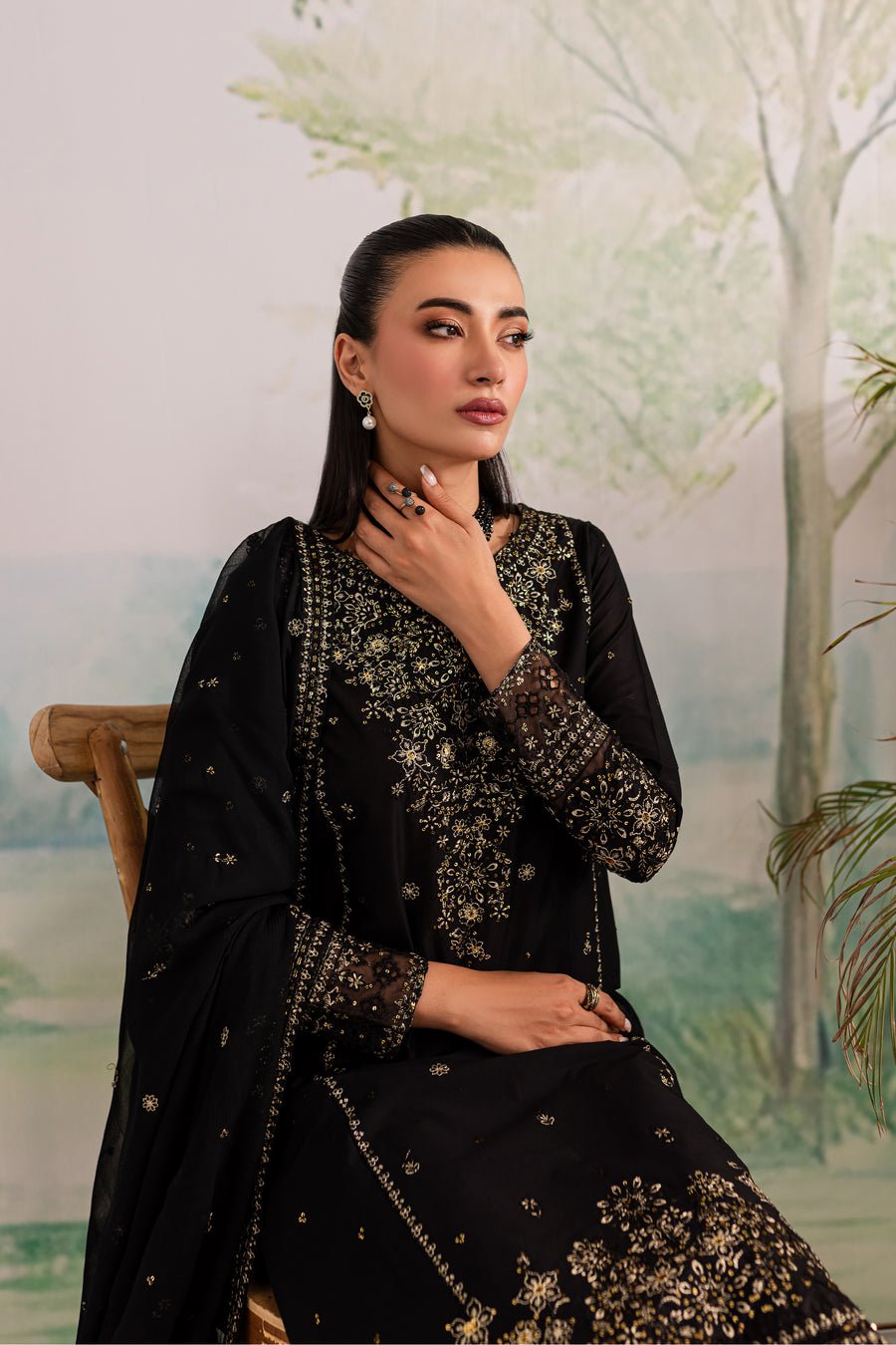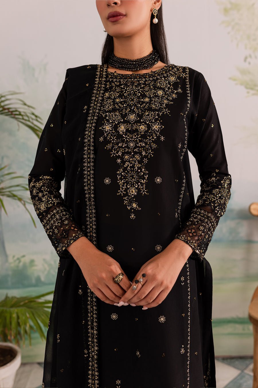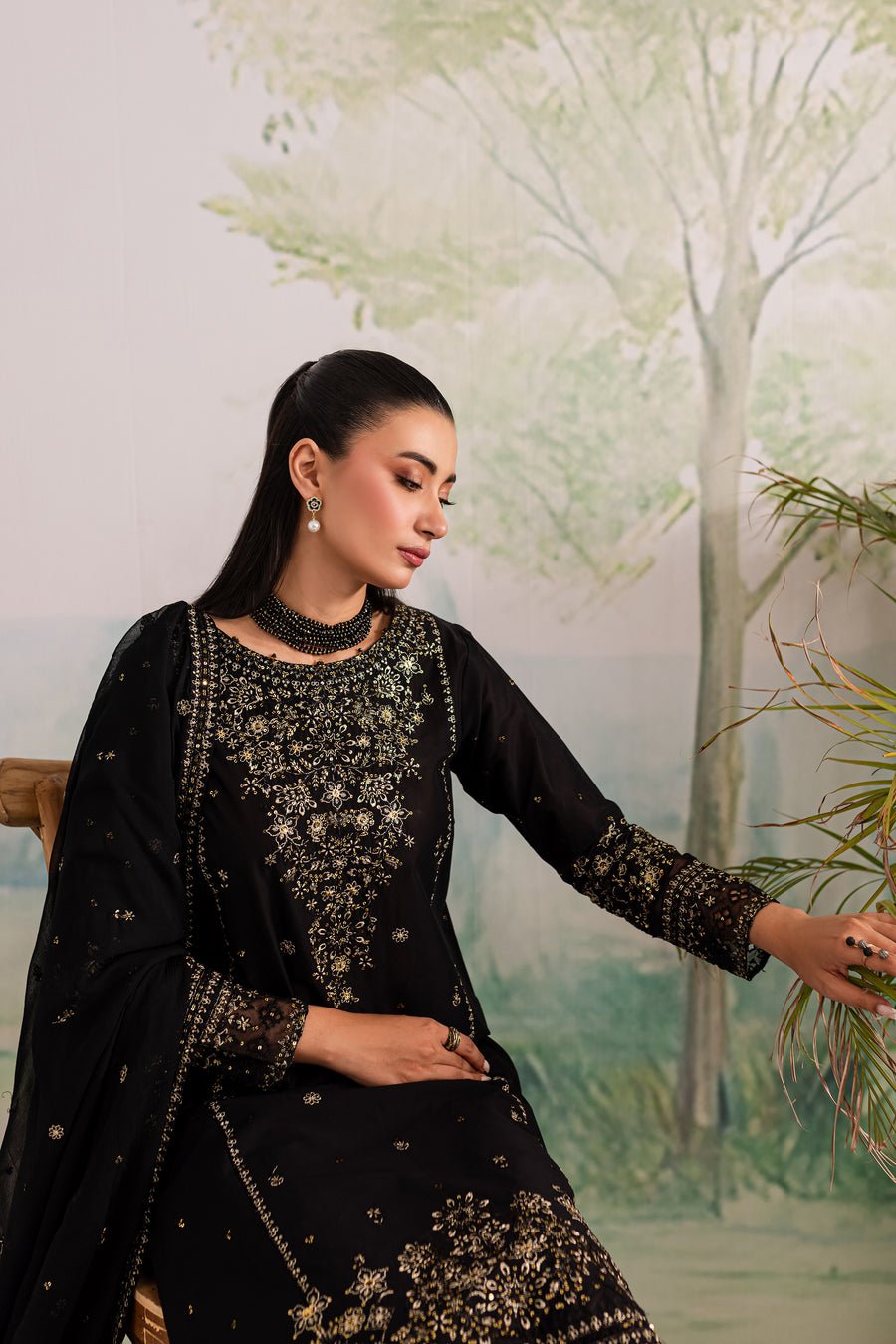 Indulge in the luxury of our ultra-soft Pima lawn fabric in a timeless black tone, valued for its smooth feel and long-lasting quality. This beautifully designed paneled shirt is highlighted with a richly embroidered neckline and delicate detailing along the center panel. The hem is finished with an elegant organza border, adding a graceful touch.