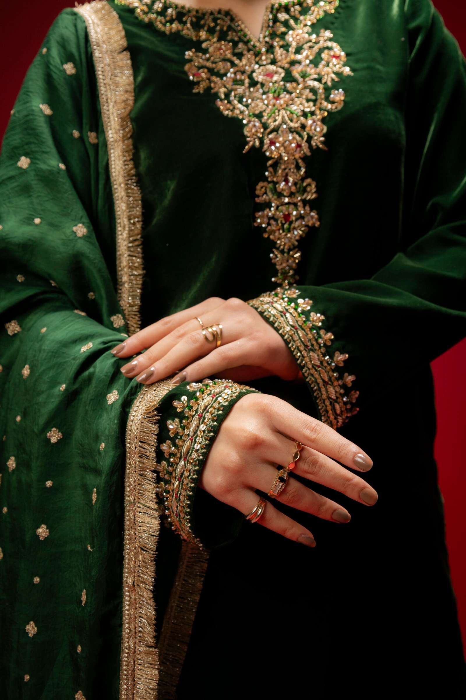 Step into elegance with this emerald green velvet ensemble, designed for sophistication and festive charm.
